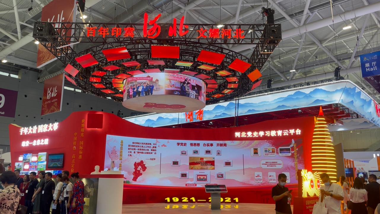 深圳文博會河北主展區(qū)面積533平方米,以百年印記、文耀河北為主題。展區(qū)整體造型以雪如意、西柏坡、雄安融合塔等河北特色符號作為展區(qū)設計元素,展示河北建設文化成就。